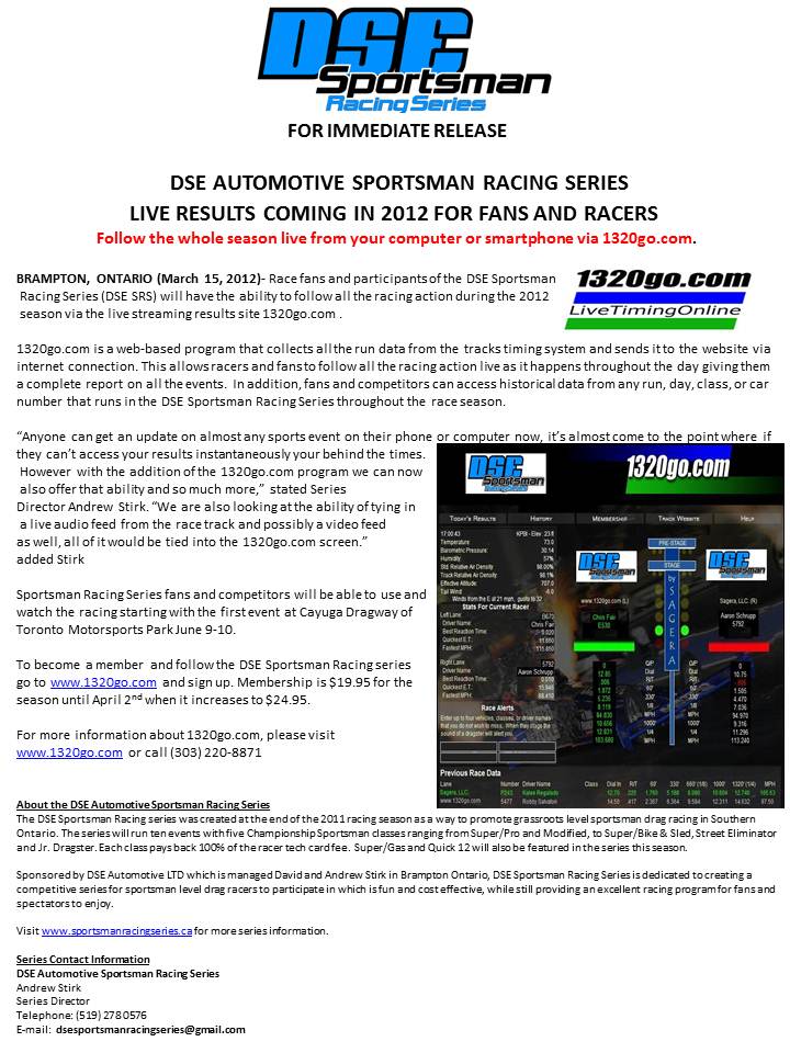 1320go.com teams up with DSE Sportsman Racing Series March 15, 2012 720 × 960 DSE AUTOMOTIVE SPORTSMAN RACING SERIES LIVE RESULTS COMING IN 2012 FOR FANS AND RACERS